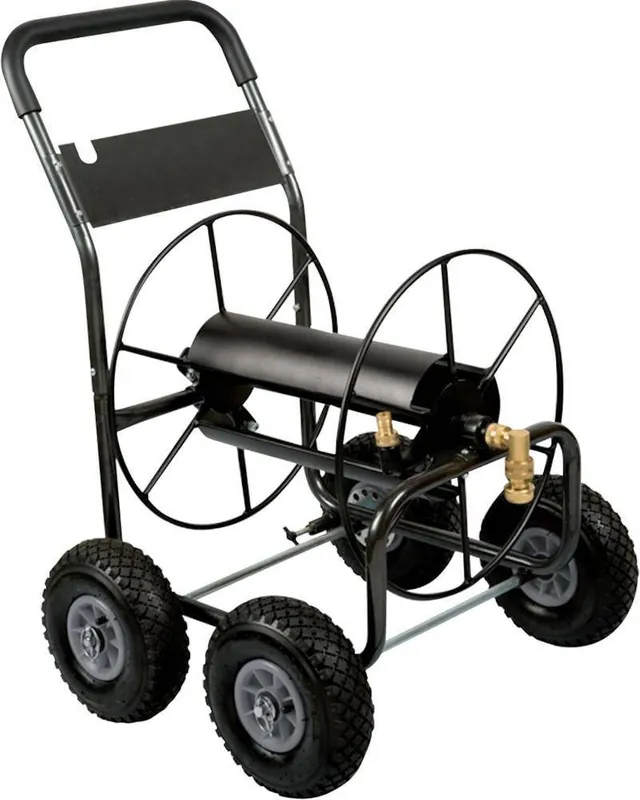 Bęben na wąż 3/4″•uchwyt Softgrip •koła z tworzywa sztucznego, piankowe, odporne na przebicie •szybkozłącze obrotowe 3/4″ z mosiądzu •przeznaczony do węży o długości 85 m