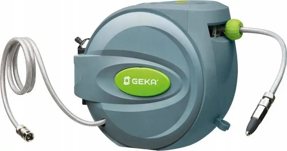Bęben na Wąż Ogrodowy 25+2m Zwijacz na Ścianę Geka Solidny metalowy pojemnik, bęben na Wąż zapewnia automatyczne i równomierne zwijanie i rozwijanie węża.Dzięki zaawansowanej blokadzie wąż można zablokować w każdym momencie.Metalowy wspornik ścienny obraca się o 180 stopni C.Zawiera wysokiej jakości solidny system wtykowy i dyszę rozpylającą. Wymiary:Rozmiar węża: ½”Wąż LW: 12,5 mmDługość węża: 25 + 2 mZakres temperatury: +4 do 45 stopni CCiśnienie robocze: 8 barówWymiary pojemnika: 515 x 310 x 460 mm