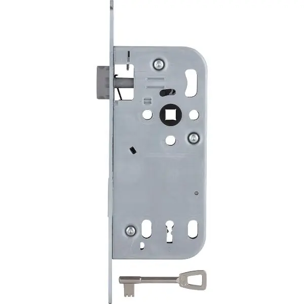 mit Rosettenlöchern- Lochmittelabstand 38 mmzusätzlich 1 Bohrung für Kurz- und Breitschildbefestigung.Durch Fallenumstellung links und rechts verwendbar.mit verstärkter Nussfeder