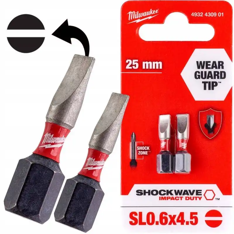 BIT UDAROWY MILWAUKEE SL 1.2 x 6.5 MM 25MM 2SZTShockwave Impact Duty™ to linia akcesoriów nie tylko idealna do ciężkich zastosowań udarowych, ale pełny system rozwiązań dla potrzeb wiercenia i mocowania.Geometria Shock Zone – zaprojektowana tak, by była elastyczna.Geometria Shock Zone zmniejsza naprężenie na końcówce, dzięki czemu jest bardziej odporna na złamanie. Połączenie konstrukcji Shock Zone oraz specjalnej obróbki cieplnej pochłania udar i pozwala aby bit zginał się podobnie jak sprężyna.Kuta i prasowana główka bita zapewnia najlepsze dopasowanie do łba śruby, bez przeskoku i zdzierania go, co wydłuża okres trwałości.Stal opracowana na życzenie – Milwaukee® niestandardowy skład metalu sprawia, że bity Shockwave są bardziej odporne na wstrząsy przy uderzeniu.DANE TECHNICZNE:TYP : SL1.2X6.5DŁUGOŚĆ: 25 mmTYP MOCOWANIA : HEX 1/4″RODZAJ WZMOCNIENIA: IMPACT 30x SHOCKWAVEZESTAW ZAWIERA:BIT UDAROWY MILWAUKEE PŁASKI SHOCKWAVE SL1.2X6.5 – 25mm Bity udarowe MILWAUKEE® SHOCKWAVE™ IMPACT DUTY to:Najtrwalsze bity na rynku zapewniające idealne dopasowanie.Hartowanie punktowe końcówki zapewnia większa odporność na zużycie i idealne dopasowanie do łba wkrętu.Unikalna strefa SHOCK ZONE® absorbuje udar i zapewnia do 30x dłuższą żywotność w porównaniu z innymi bitami udarowymi dostępnymi na rynku oraz jest w stanie przenieść aż do3x większy moment skręcający.Specjalnie opracowany stop stali ALLOY76™ poddany dodatkowej obróbce termicznej zapewnia maksymalną odporność na uszkodzenia. Bity udarowe SHOCKWAVE™ gwarantują ekstremalną trwałość nawet przy najbardziej wymagających zastosowaniach.