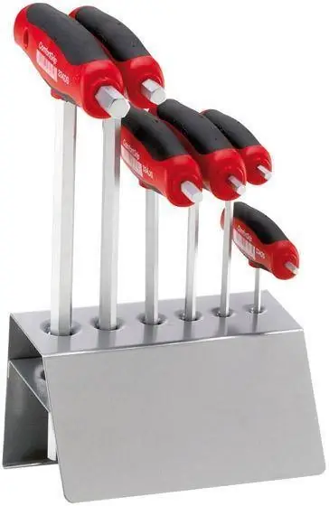 Zestaw wkrętaków sześciokątnych z uchwytem poprzecznym i napędem bocznymWykonanie: ze stali chromowo-wanadowej, hartowane na wskroś i chromowane matowo. Wkrętak posiada całościowy grot z bocznym napędem do przenoszenia dużych momentówobrotowych. Z ergonomicznym, wielokomponentowym uchwytem poprzecznym z miękkimi strefami i otworem dozawieszenia. Dostawa w stojaku warsztatowym.