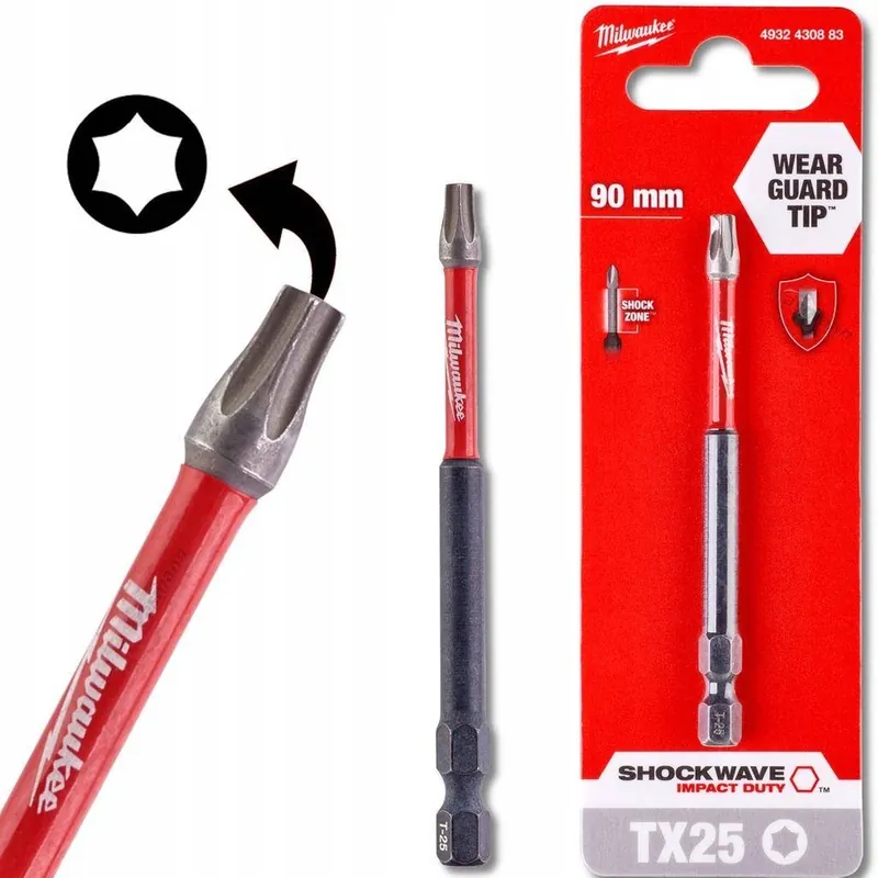 MILWAUKEE BIT UDAR SHOCKWAVE TX20 90MM 1SZTShockwave Impact Duty™ to linia akcesoriów nie tylko idealna do ciężkich zastosowań udarowych, ale pełny system rozwiązań dla potrzeb wiercenia i mocowania.Geometria Shock Zone – zaprojektowana tak, by była elastyczna.Geometria Shock Zone zmniejsza naprężenie na końcówce, dzięki czemu jest bardziej odporna na złamanie. Połączenie konstrukcji Shock Zone oraz specjalnej obróbki cieplnej pochłania udary i pozwala aby bit zginał się podobnie jak sprężyna.Kuta i prasowana główka bita zapewnia najlepsze dopasowanie do łba śruby, bez przeskoku i zdzierania go, co wydłuża okres trwałości.Stal opracowana na życzenie – Milwaukee® niestandardowy skład metalu sprawia, że bity Shockwave są bardziej odporne na wstrząsy przy uderzeniu.DANE TECHNICZNE:TYP : TX 20DŁUGOŚĆ: 90 mmTYP MOCOWANIA : HEX 1/4″RODZAJ WZMOCNIENIA: IMPACT 30x SHOCKWAVEZESTAW ZAWIERA:BIT UDAROWY MILWAUKEE SHOCKWAVE TX 20 – 90mm ORYGINALNIE ZAMKNIĘTY BLISTER 1 SZTUKABity udarowe MILWAUKEE® SHOCKWAVE™ IMPACT DUTY to:Najtrwalsze bity na rynku zapewniające idealne dopasowanie.Hartowanie punktowe końcówki zapewnia większa odporność na zużycie i idealne dopasowanie do łba wkrętu.Unikalna strefa SHOCK ZONE® absorbuje udar i zapewnia do 30x dłuższą żywotność w porównaniu z innymi bitami udarowymi dostępnymi na rynku oraz jest w stanie przenieść aż do3x większy moment skręcający.Specjalnie opracowany stop stali ALLOY76™ poddany dodatkowej obróbce termicznej zapewnia maksymalną odporność na uszkodzenia. Bity udarowe SHOCKWAVE™ gwarantują ekstremalną trwałość nawet przy najbardziej wymagających zastosowaniach.