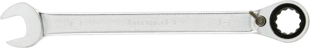 Klucz płaski z przełączaną grzechotką pierścieniowąWykonanie: ze stali chromowo-wanadowej, chromowany matowo. Precyzyjnie uzębiony mechanizm grzechotkiz 72 zębami i kątem roboczym 5°. Głowica grzechotkowa jest odgięta kątowo o 13°, odchylenie szczęk 15°.