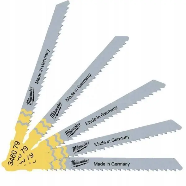 MILWAUKEE Brzeszczoty do drewna, do cięcia po łuku 75 mm 5 szt.Art: 4932265312Wszystkie nasze brzeszczoty do cięcia po łuku charakteryzują się wąskim korpusem dla poprawienia możliwości manewrowania.Brzeszczoty wyrzynarki 4932265312 mają zęby tnące po obu stronach, nadają się do cięcia m.in. drewna, pcvZęby z tyłu brzeszczotu umożliwiają łatwe wycinanie zakrzywionych i ostrych łuków.Dla uzyskania lepszych wyników przy cięciu po zakrzywionych łukach należy pracować przy wyłączonym ruchu wahadłowym.Dane techniczne:Cięcie spiralne: TakCięcie zgrubne: TakDługość ostrza (mm): 75Podziałka zębów (mm): 4/1,2Ilość w op.: 1Maks. zdolność cięcia w drewnie (mm): <30Maks. zdolność cięcia w PVC (mm): <30Kody kolorowe brzeszczotówDo wszystkich typów drewna, laminowanych płyt wiórowych, płyt wiórowych, sklejki, płyt stolarskich i tworzyw sztucznych. Brzeszczot koloru srebrnego.Do wszystkich typów metali żelaznych i nieżelaznych, stali, aluminium, mosiądzu, miedzi, stali nierdzewnej, ołowiu, cyny i materiałów wielowarstwowych. Brzeszczot koloru srebrnego.Do cięcia szerokiej gamy wyrobów, kartonu, gumy, włókna szklanego, pianki i materiałów ściernych. Brzeszczot koloru czarnego.Brzeszczoty bimetalowe są koloru białego z chwytem odpowiedniego koloru; żółty do drewna i niebieski do metalu.Rodzaje materiałów:HCS - Brzeszczoty ze stali wysokowęglowej są stosowane do cięcia wszystkich typów drewna i tworzywa sztucznego.HSS - Brzeszczoty ze stali szybkotnącej są odpowiednie do cięcia metali, metali nieżelaznych i aluminium.Nasyp z węglika - Te brzeszczoty mają na krawędzi nasyp z węglika wolframu, dzięki czemu nadają się do materiałów ściernych.TC - Brzeszczoty z końcówkami zębów z węglika wolframu nadają się idealnie do wyrobów wzmacnianych włóknem szklanym. Takie brzeszczoty z ciągłą krawędzią tnącą zębów z węglika wolframu są odpowiednie do szczególnie twardych materiałów, takich jak stal nierdzewna.Bi-Metal - Brzeszczoty bimetalowe mają zęby ze stali szybkotnącej zgrzewane wiązką elektronów na sprężystej części tylnej ze stali stopowej. Brzeszczoty te zapewniają maksymalną wydajność w najbardziej wymagających zastosowaniach zarówno w przypadku drewna, jak i metalu.Brzeszczoty bimetalowe mają następujące zalety:Sprężystość i wytrzymałość na uderzenia.Długa trwałość. Brzeszczoty do metalu mają trwałość 2 razy dłuższą, a do drewna więcej niż 5 razy dłuższą niż tradycyjne brzeszczoty HCS i HSS.Większa prędkość zużycia i odporność na temperaturę zapewniają, że zęby dłużej pozostają ostre.Szybsze cięcie.Sprężysta i wytrzymała na uderzenia część tylna do najbardziej wymagających zastosowańZęby ze stali szybkotnącej z super twardą krawędzią tnącąBi-MetalChwytyBrzeszczoty z chwytem T - nadają się do większości głównych marek: AEG, Bosch, DeWalt, Festool, Hitachi, Hilti, Mafell, Makita, Metabo, Milwaukee®, RyobiBrzeszczoty z chwytem specjalnym - Chwyt U do elektronarzędzi Black & Decker, Kress, Ryobi, SkilWskazówki techniczneDługość brzeszczotu oznacza jego odcinek z uzębieniem tnącym (A – mm). Podziałka zębów jest mierzona w milimetrach (mm) od wierzchołka do wierzchołka zęba (B – mm). Wybór odpowiedniej podziałki zębów jest uzależniony od grubości ciętego materiału. Najlepszą zasadą jest stosowanie brzeszczotu, którego 3 zęby są w kontakcie ciągłym z materiałem obrabianym; jest to sytuacja optymalna, na przykład dla materiału takiego jak metal o grubości powyżej 4 mm zaleca się podziałkę 2 mm lub większą.Dla metali o grubości 1,5 – 3,5 mm wymagana jest podziałka 1,2 do 1,4. Przy cięciu cienkich blach metalowych o grubości poniżej 1,5 mm zalecana jest podziałka zębów od 0,7 do 1,2 mm. Ogólną zasadą przy cięciu drewna jest stosowanie tym większej podziałki zębów, im większa jest prędkość i im bardziej zgrubne będzie cięcie.Do cięcia bardzo cienkich arkuszy materiałów zaleca się umieszczenie materiału na grubszej podkładce w celu zabezpieczenia arkusza przed złamaniem.Przy cięciu metali i tworzyw sztucznych zalecamy stosowanie cieczy chłodząco-smarującej w celu zwiększenia żywotności brzeszczotu.Chłodziwo materiału :1. Ciecz chłodząco - smarująca2. Olej terpentynowy3. WodaBrzeszczoty są dostępne w opakowaniach po 5 i po 25 sztuk. Nasze opakowanie na 25 sztuk jest wielokrotnego użytku, umożliwiając łatwe wyjmowanie i wkładanie brzeszczotów.Nasz system kolorów brzeszczotów stosowany jest również na opakowaniach w połączeniu z piktogramami w celu zapewnienia prawidłowego wyboru brzeszczotu do danego zastosowania.