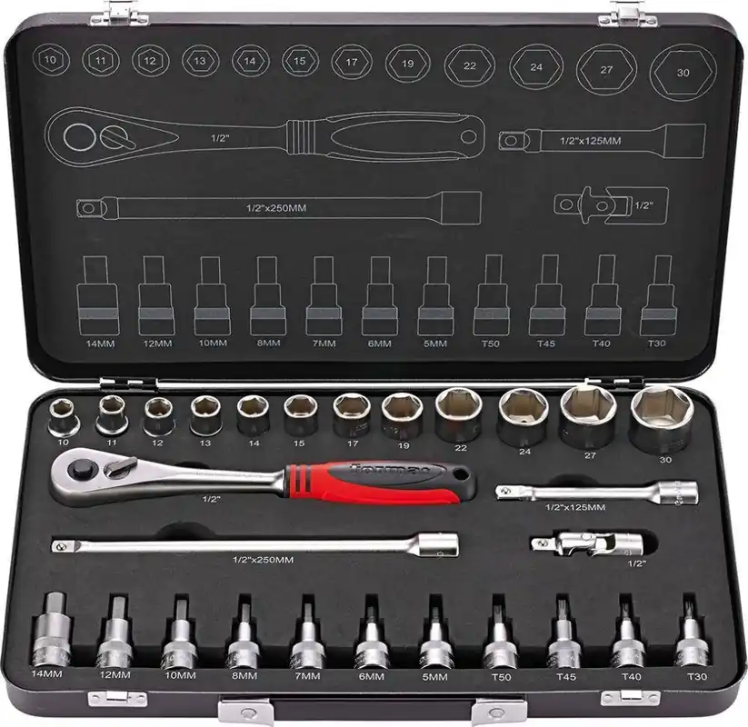Zestaw sześciokątnych końcówek wymiennych klucza nasadowego 1/2″Wykonanie: narzędzia ze stali chromowo-wanadowej, chromowane matowo, końcówki wymienne kluczanasadowego radełkowane, gniazda sześcio- i czworokątne o zaokrąglonych narożnikach doochrony gniazda napędowego i łba śruby. Grzechotka dwukierunkowa z przełącznikiem dźwigniowym, 72-zęby, kąt powrotu 5°. Dostawa w wytrzymałej, czerwono-czarnej kasecie z tworzywa sztucznego, ze schematemrozmieszczenia narzędzi w pokrywie. Narzędzia są umieszczone w 2-kolorowym wkładziepiankowym, gdzie miejsca po brakujących narzędziach są dobrze widoczne.Zawartość zestawu: 1 grzechotka dwukierunkowa z przełącznikiem dźwigniowym 19 sześciokątnych końcówek wymiennych klucza nasadowego 8; 9; 10; 11; 12; 13; 14; 15; 16; 17; 18; 19; 21; 22; 24; 27; 30; 32; 34 mm 4 końcówki wymienne klucza, sześciokątne, długie, 10; 13; 17; 19 mm 2 nasadki do świec zapłonowych 16; 21 mm 1 uchwyt poprzeczny z elementem ślizgowym 2 przedłużki 125; 250 mm1 przegub Kardana