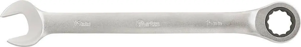 Klucz płasko-oczkowy, z grzechotką•chromowany matowo •ze stali chromowo-wanadowej •końcówka otwarta odchylona od osi o 15° •końcówka oczkowa z grzechotką, prosta •kąt powrotu zapadki 6°