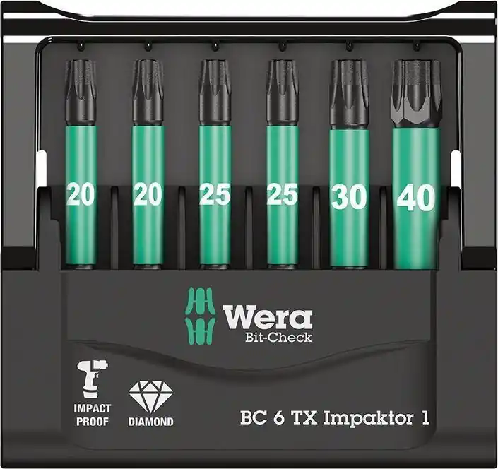ZESTAW BITÓW MINI-CHECK WERA 6-CZĘŚCIOWY TORXProfesjonalny zestaw bitów niemieckiej firmy Wera. Zestaw zawiera 6 bitów o długości 50mm. Komplet znajduje się w opakowaniu z tworzywa sztucznego z funkcją zamykania. Końcówki ułożone w przejrzysty sposób dzięki czemu mogą być szybko wyciągnięte.Zestaw zawiera:6 bitów do wkrętów z wewnętrznym gniazdem TORX T 10; 15; 20; 25; 30; 40Ekstra wytrzymałe groty do montażu twardego, np. w elementach z blachy lub metalu. W początkowej fazie gwint zapewnia równomierny montaż wkrętu. W chwili kontaktu łba wkrętu z powierzchnią materiału dochodzi do gwałtownego wzrostu wartości momentu obrotowego, który oddziałuje na wkręt i narzędzie. Dlatego zbyt twarde końcówki są tutaj narażone na pęknięcie. Ekstra wytrzymałe groty Wera zapobiegają przedwczesnemu zużyciu końcówek grota.