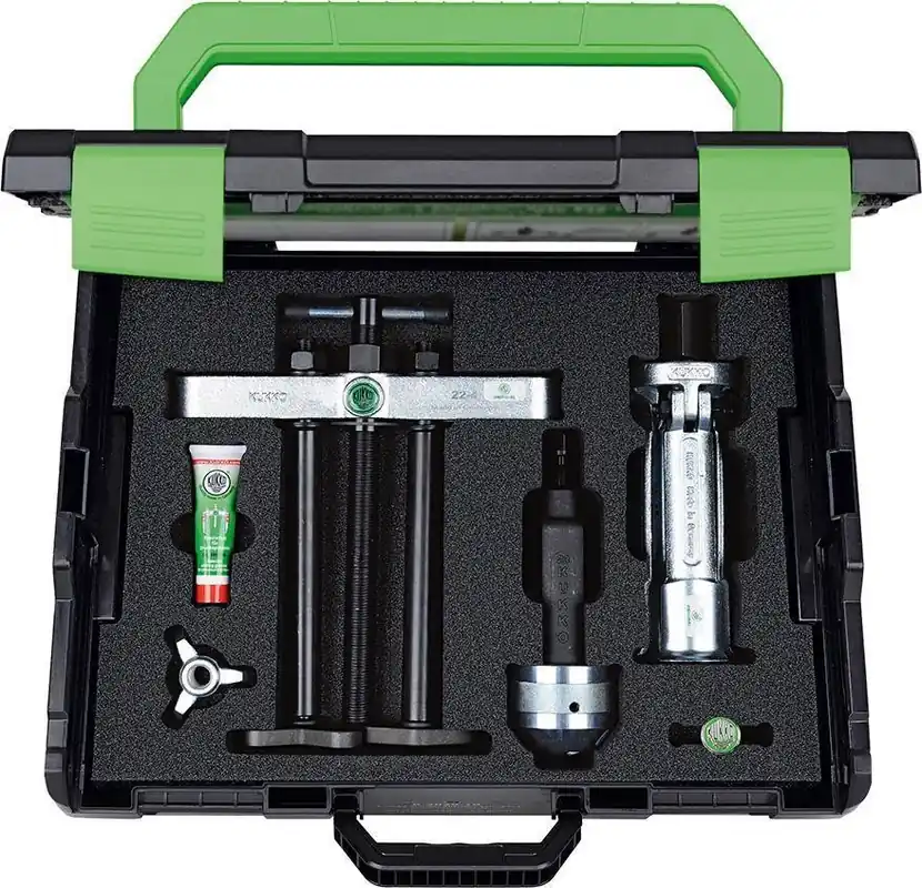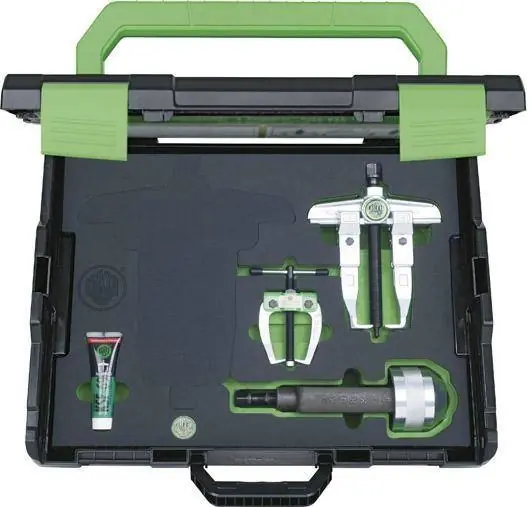 Zestaw ściągaczy i wyciągaczy do łożysk kulkowychWykonanie: Dostawa w walizce metalowej. Zawartość zestawu: 7 wyciągaczy wewnętrznych (12–58 mm) 21-1 do 21-6 1 wyciągacz wewnętrzny (65–110 mm) 21-89 3 podpornice 21-1; 22-2; 22-4 1 uchwyt do ściągania pierścieni wewnętrznych łożysk kulkowych 23 1 ściągacz dwuramienny do zacisków główkowych w akumulatorach 43-1 2 ściągacze dwuramienne 20-1; 20-2 Zastosowanie: Do ściągania łożysk kulkowych, łożysk, kół zębatych, pierścieni wewnętrznych łożysk rozłącznych, łożysk kulkowych zwykłych, a także ściągania umieszczonych blisko siebie łożysk kulkowych, zewnętrznych pierścieni łożysk kulkowych i panewek.