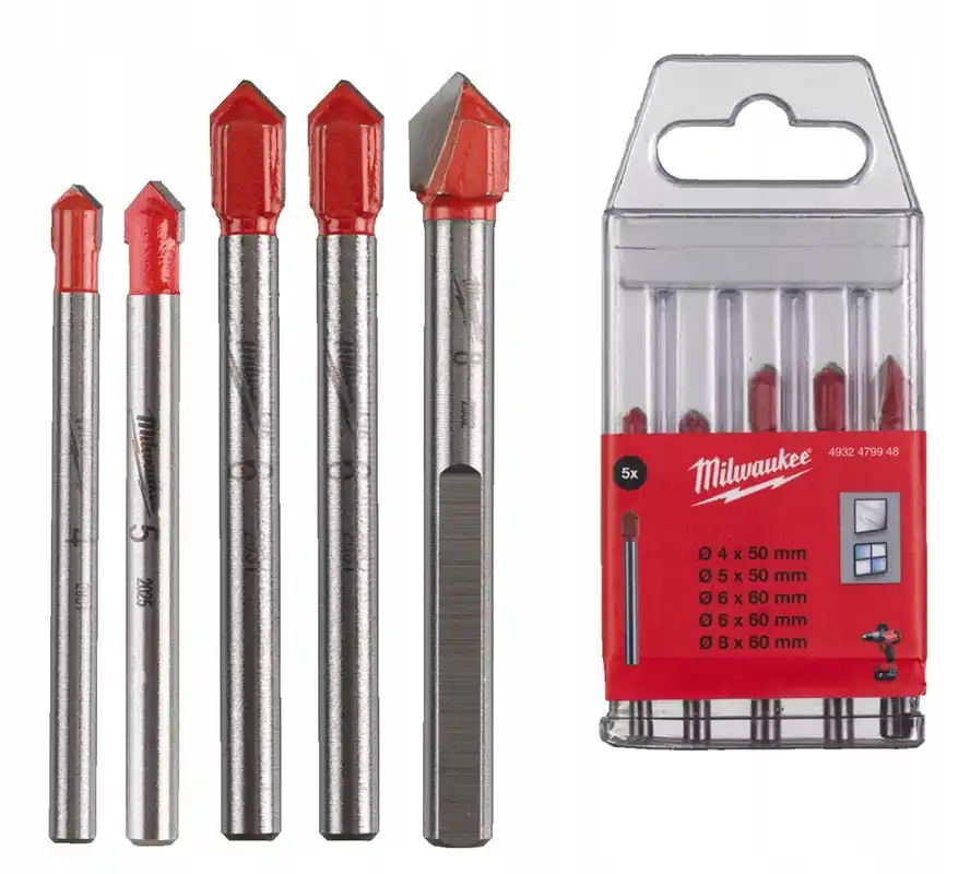 ZESTAW WIERTEŁ DO SZKŁA/CERAMIKI – 5 szt.MARKI MILWAUKEENumer artykułu: 4932479948Wyposażenie:4 mm – 1 szt.5 mm – 1 szt.6 mm – 2 szt.8 mm – 1 szt.Cechy produktu:Odpowiednie do szkła, płytek ceramicznych, luster, elementów ceramicznych.Wyprodukowano w Niemczech.Główka wzmocniona węglikiem zapewnia większą trwałość wiertła.Główka pomalowana na czerwono.Od ⌀5mm uchwyt sfazowany z 3 stronDane technicznie:Długość całkowita (mm): 50Średnica (mm): 4, 5Długość całkowita (mm): 60Średnica (mm): 6, 8