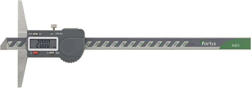 Głębokościomierz cyfrowy ze ściętą powierzchnią pomiarowąWykonanie: ze stali nierdzewnej, hartowanej, powierzchnie pomiarowe drobno szlifowane i hartowane,ze śrubą ustalającą, wysokość cyfr na wyświetlaczu LCD 8 mm. Dostawa z baterią CR2032, 3V, w etui. Funkcje: włączanie i automatyczne wyłączanie, przełączanie mm/cale, zerowanie możliwe w każdejpozycji.