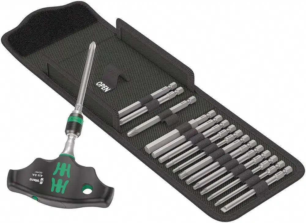 Zestaw bitów Kraftform Kompakt 400 RAWykonanie: bity ciągliwo-twarde. Z uchwytem do bitów z rękojeścią poprzeczną z funkcją grzechotki i uchwytem szybkowymiennym Rapidaptor. Zintegrowana w dwukomponentowej rękojeści grzechotka z drobnym uzębieniem (80 zębów, kąt powrotu zapadki 4,5°) zapewnia bezpieczną i szybką pracę. Uchwyt do bitów Rapidaptor z tuleją szybkoobrotową umożliwia szybką wymianę bitów. Bity i rękojeść ułożone w przejrzysty sposób w składanym etui.