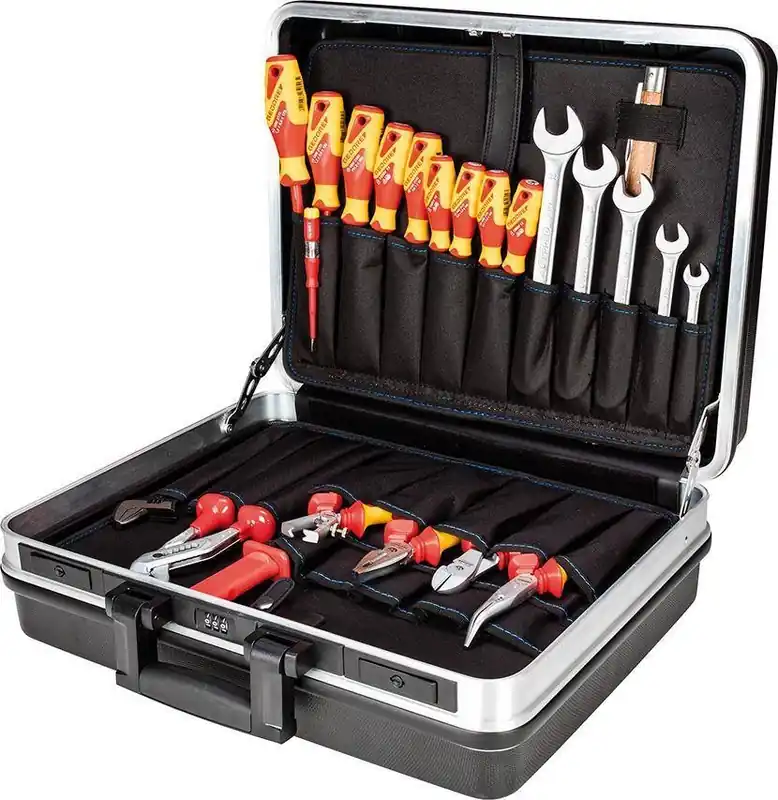 Zestaw narzędzi dla mechanika Nr. S 1007 M, 175-cz.Zawartość zestawu: 12 kluczy oczkowych dwustronnych 6 x 7; 8 x 9; 10 x 11; 12 x 13; 14 x 15; 16 x 17; 18 x19; 20 x 22; 21 x 23; 24 x 27; 25 x 28; 30 x 32 mm 12 kluczy płaskich dwustronnych 6 x 7; 8 x 9; 10 x 11; 12 x 13; 14 x 15; 16 x 17; 18 x 19;20 x 22; 21 x 23; 24 x 27; 25 x 28; 30 x 32 mm 20 sześciokątnych końcówek wymiennych klucza nasadowego 1/2″ 8; 10; 11; 12; 13; 14; 15;16; 17; 18; 19; 21; 22; 23; 24; 26; 27; 28; 30; 32 mm 1 grzechotka dwukierunkowa 1/2″ 2 przedłużki 1/2″ 125; 250 mm 1 przegub Kardana 1/2″ 1 uchwyt poprzeczny z elementem ślizgowym 1/2″ 11 sześciokątnych końcówek wymiennych klucza nasadowego 1/4″ 4; 4,5; 5; 5,5; 6; 7; 8; 9;10; 11; 13 mm 1 grzechotka dwukierunkowa 1/4″ 1 uchwyt poprzeczny z elementem ślizgowym 1/4″ 1 przedłużka 1/4″, 97 mm 1 przegub Kardana 1/4″ 1 rękojeść wkrętaka 1/4″ 9 nasadek do śrub z łbem z gniazdem sześciokątnym 5; 6; 7; 8; 9; 10; 12; 14; 17 mm 1 klucz do luzowania śrub 1 adapter do bitów, czworokąt 1/2″ na sześciokąt 5/16″ 1 adapter do bitów, czworokąt 1/4″ na sześciokąt 5/16″ 4 bity płaskie 7; 8; 9; 12 mm 4 bity do śrub z łbem z gniazdem sześciokątnym 5; 6; 8; 10 mm 3 bity krzyżowe PH 2; 3; 4 1 zestaw kluczy trzpieniowych, kątowych, 8-cz. 2; 2,5; 3; 4; 5; 6; 8; 10 mm 1 szczypce dla mechaników 175 mm 1 szczypce uniwersalne 248 mm 1 szczypce do rur 1.1/2″ 1 szczypce zaciskowe 240 mm 2 szczypiec do zewnętrznych pierścieni osadczych, szczęki proste A 1; A 2 2 szczypiec do zewnętrznych pierścieni osadczych, szczęki wygięte A 11; A 21 2 szczypiec do wewnętrznych pierścieni osadczych, szczęki proste J 1; J 2 2 szczypiec do wewnętrznych pierścieni osadczych, szczęki wygięte J 11; J 21 1 szczypce uniwersalne 180 mm, wzmocnione 1 szczypce tnące boczne 160 mm, wzmocnione 1 szczypce tnące czołowe 160 mm 1 szczypce płasko-okrągłe, proste 160 mm 1 szczypce płasko-okrągłe, wygięte 160 mm 3 wkrętaki płaskie z sześciokątnym zabierakiem 6,5; 8; 10 mm 3 wkrętaki płaskie 3; 4; 5,5 mm 3 wkrętaki krzyżowe PH 1; 2; 3 2 wkrętaki krzyżowe PZ 1; 2 1 wkrętak płaski, krótki 6,5 mm 2 wkrętaki krzyżowe, krótkie PH 1; 2 6 wybijaków 2; 3; 4; 5; 6; 8 mm 1 punktak 4 x 120 mm 2 wybijaki 3; 5 mm 3 przecinaki płaskie 125; 150; 200 mm 1 przecinak krzyżowy 125 mm 1 nożyce do blachy 250 mm 1 klucz płaski, nastawny do 28 mm 1 piła do metalu mała PUK®, 290 mm 1 piła kabłąkowa do metalu 520 mm 1 piła otwornica 380 mm 1 pilnik płaski 200 mm nacięcie 2 1 pilnik trójkątny 200 mm, nacięcie 2 1 pilnik okrągły 200 mm, nacięcie 2 1 pilnik półokrągły 200 mm, nacięcie 2 1 zestaw pilników kluczykowych 6-cz. 1 pilnik do gwintów 1 nóż do kabli i dla elektryków 195 mm 1 młotek ślusarski Rotband-Plus 500 g 1 młotek z miękkim bijakiem 40 mm Ø 1 skrobak trójkątny, 200 mm 1 szydło czworokątne 1 łom 400 mm 1 dźwignik magnetyczny 1800 g 1 zestaw wkrętaków 8-cz. 1 olejarka 0,3 l 1 taśma miernicza 3 m 1 rysik traserski 250 mm 1 suwmiarka 140 mm