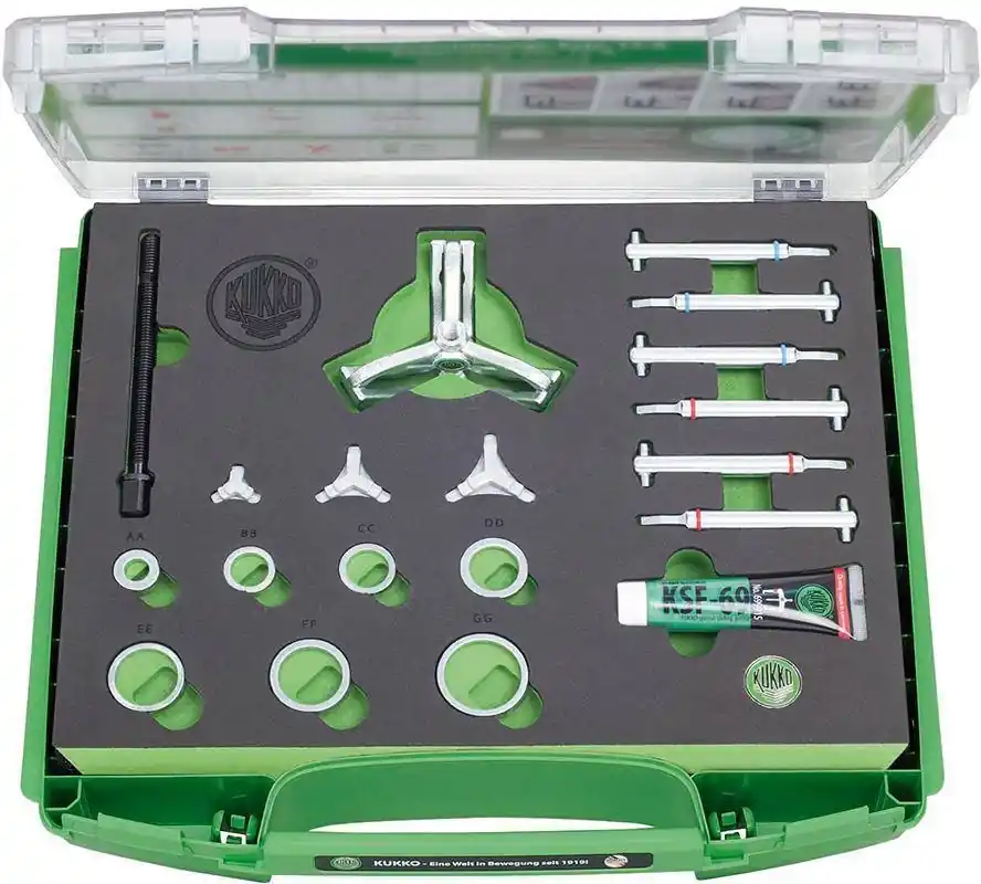 Zestaw ściągacza PULLPO ®Wykonanie: ramiona do ściągacza ulepszane. Specjalny kształt trawersu zapewnia samoczynne napinanieramion do ściągacza. Specjalne haki do precyzyjnego założenia w bieżniach łożyskzapewniają optymalne mocowanie i wysokie siły demontażu. Obie wersje haków są barwnieoznakowane. Łatwe zawieszenie ramion do ściągacza z ruchem obrotowym 90° w trawersie.Boczne powierzchnie haków służą do optymalnego ustawienia trawersów. Zastosowanie: łożyska kulkowe zamontowane na wałach lub w obudowach można łatwo ściągnąć. Połączenie zmłotkiem ślizgowym pozwala na bezdotykowe ściąganie.Zawartość zestawu: 1 trawers 1 wrzeciono 8 haków 7 pierścieni podporowych 4 czteroramienne przeciwdociski