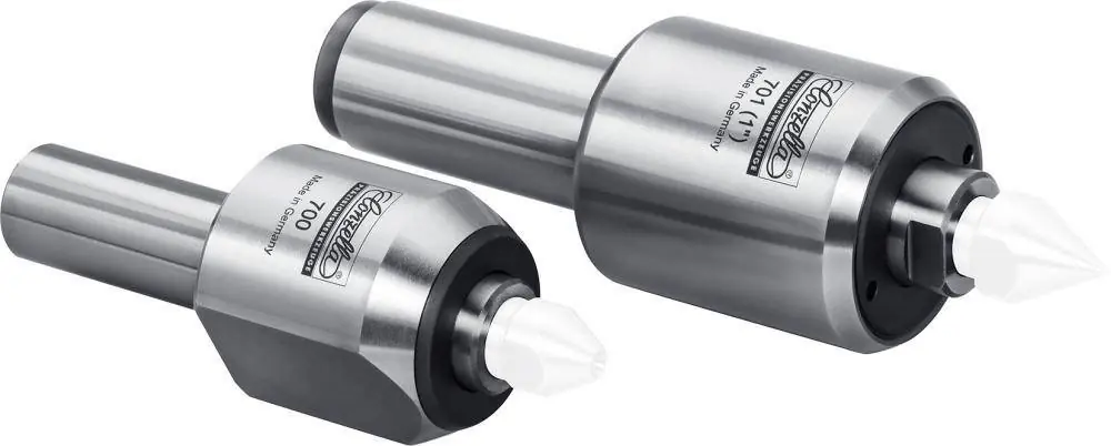 Kieł centrujący obrotowy z końcówkami wymiennymiWykonanie: całkowicie hartowany i szlifowany. Osiowa kompensacja długości dzięki sprężynie.Pierścień uszczelniający wału zapobiega wnikaniu zabrudzeń, stały smar wystarczający nacały okres eksploatacji. Wymienne wkładki zapewniają maksymalną uniwersalność.