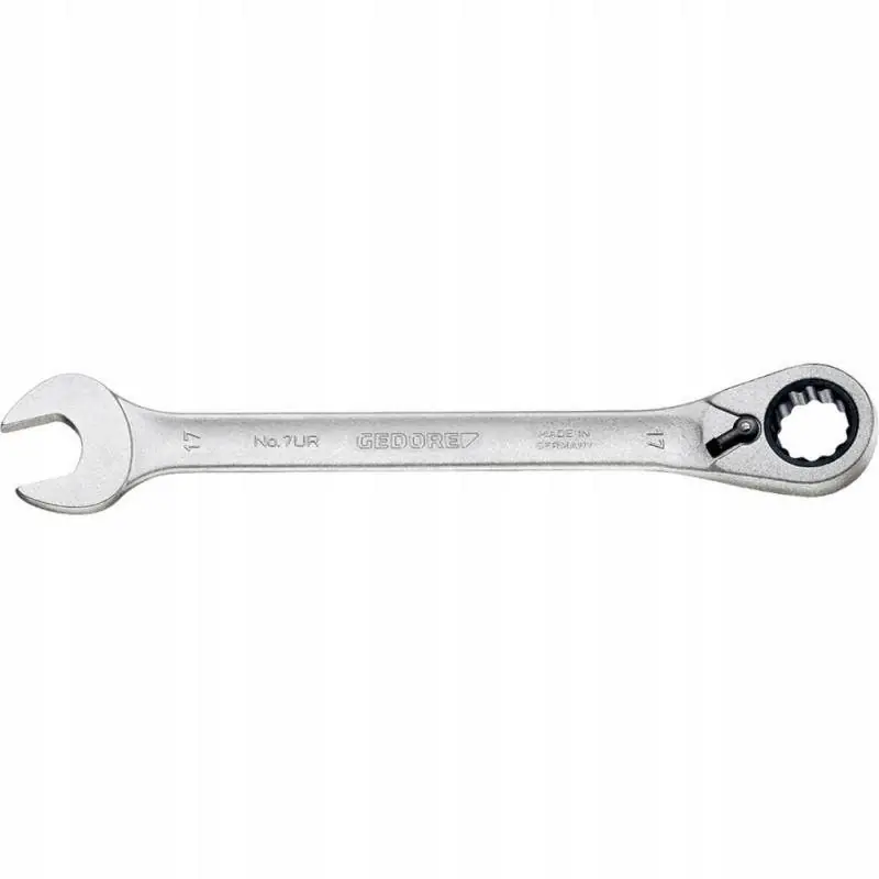 Profesjonalny Klucz Płasko Oczkowy z Grzechotką GEDOREProfesjonalny i solidny klucz płasko-oczkowy z grzechotką niemieckiej firmy GEDORE. Klucz charakteryzuje się najwyższą jakością wykonania oraz długą, bezawaryjną pracą.Ekstremalnie szybkie zastosowanie również w bardzo wąskich miejscach z uwagi na bardzo mały kąt roboczy Firmie GEDORE udało się zredukować prawie do zera luz pomiędzy zapadką a wkładką poprzez mechanikę natychmiastowego zetknięcia się narzędzia. Poprzez dalszy rozwój technologii grzechotek uzyskano bardzo mały, efektywny kąt roboczy, tzn. martwy kąt roboczy klucza został zredukowany do minimum. Klucz zaczyna działać aktywnie już w tym miejscu, gdzie inne jeszcze nie zaczęły.Kąt roboczy: 7° od 8 do 15 mm oraz 6° od 16 do 24 mmBardzo wysokie przenoszenie momentu obrotowegoPoręczne poprzez profil drążony na trzonkuGeometria odporna na odkształcenia z efektem belki dwuteowejStal wanadowa GEDORE 31CrV3Szczęki zeszlifowane dokładnie do rozwartości kluczaDla efektywnego odkręcania lub szybkiego dociągania, z dźwignią przełączania