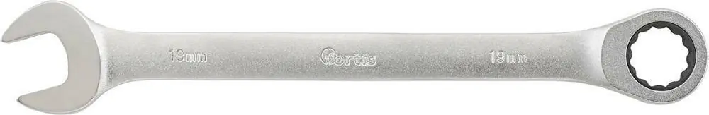 Klucz płasko-oczkowy, z grzechotką•chromowany matowo •ze stali chromowo-wanadowej •końcówka otwarta odchylona od osi o 15° •końcówka oczkowa z grzechotką, prosta •kąt powrotu zapadki 6°