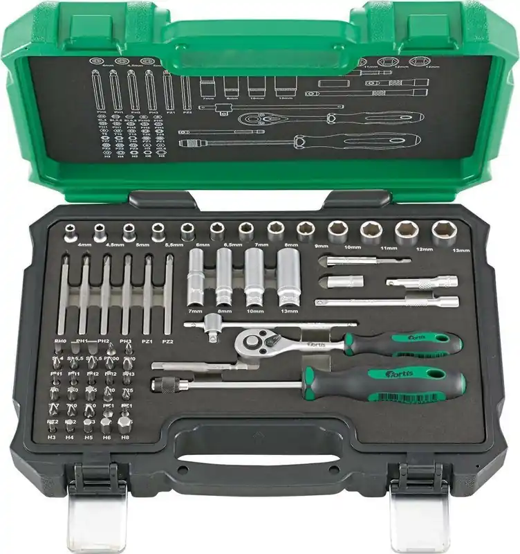 Zestaw końcówek wymiennych klucza nasadowego 1/4″•końcówki wymienne klucza nasadowego i akcesoria ze stali chromowo-wanadowej •kute i chromowane matowo •trzpienie wkrętakowych końcówek wymiennych klucza nasadowego wykonane ze stali S2 •kaseta z tworzywa sztucznego odporna na uderzenia, zamknięcia metalowe •narzędzia ułożone przejrzyście w dwukolorowej wkładce piankowej •schemat rozmieszczenia narzędzi w pokrywie Dostawa: w kasecie z tworzywa sztucznego. Zawartość: Grzechotka dwukierunkowa z przełącznikiem dźwigniowym 12 sześciokątnych końcówek wymiennych klucza nasadowego 4; 5; 5,5; 6; 7; 8; 9; 10; 11; 12; 13; 14 mm 4 wkrętakowe końcówki wymienne klucza nasadowego do śrub z gniazdem sześciokątnym 3; 4; 5; 6 mm 2 wkrętakowe końcówki wymienne klucza nasadowego do śrub z rowkiem 4; 5,5 mm 3 wkrętakowe końcówki wymienne klucza nasadowego do śrub z gniazdem krzyżowym PH 1; PH 2; PH 3 3 wkrętakowe końcówki wymienne klucza nasadowego do śrub z gniazdem krzyżowym PZ 1; PZ 2; PZ 3 6 wkrętakowych końcówek wymiennych klucza nasadowego do śrub z gniazdem TORX® T 10; T 15; T 20; T 25; T 30; T 40 Uchwyt poprzeczny z elementem ślizgowym 2 przedłużki 50; 150 mm Rękojeść z czopem czworokątnym Przegub Kardana