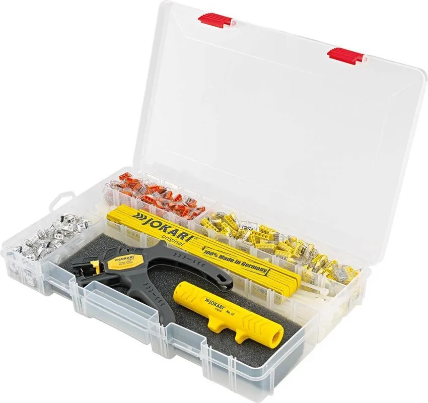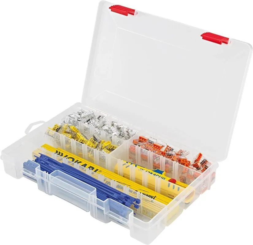 Komplet złączek i ściągaczy izolacjiWykonanie: dostarczane w walizce z tworzywa sztucznego.Zawartość: 1 ściągacz izolacji No. 15, Ø 8–13 mm 50 złączek 2-przewodowych Wago COMPACT, białe 50 złączek 3-przewodowych Wago COMPACT, pomarańczore 25 złączek 5-przewodowych Wago COMPACT, żółte 100 opasek kablowych 3,5 x 140 mm, niebieskie 1 metrówka składana drewniana 2 m