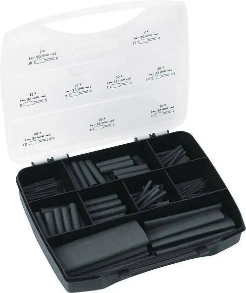 Asortyment wężyków termokurczliwych, 385 częściWykonanie: z poliolefiny usieciowionej przez napromieniowanie (PEX), czarne i przezroczyste,zewnętrzna ścianka samogasnąca (poza przezroczystymi wężami termokurczliwymi). Węże sąwyposażone w topiący się na gorąco wewnętrzny klej , chronią w ten sposób przed wilgocią i są idealne do stosowania na zewnątrz. Stopień kurczliwości 3:1. Klasa tworzywa izolującego według VDE 0530, wytrzymałość na przebicie według ASTM D 2671. Nie zawierają sylikonu, nie wchodzą w reakcję z miedzią, odporne na promieniowanie UV,rozpuszczalniki, kwasy i zasady. Dostawa w walizce z tworzywa sztucznego. Zastosowanie: idealne do izolowania, znakowania kolorami oraz jako ochrona przed załamywaniem welektronice i konfekcjonowaniu kabli. Wskazówka: Aby właściwie chronić, węże kurczliwe muszą zostać skurczone od co najmniej 20% do conajwyżej 80% swojej maksymalnej możliwości skurczania.Zawartość zestawu: 100 szt. Ø 3,0 mm, długość 40 mm, grubość ścianki 1,00 mm 100 szt. Ø 3,0 mm, długość 50 mm, grubość ścianki 1,00 mm 60 szt. Ø 6,0 mm, długość 35 mm, grubość ścianki 1,10 mm 40 szt. Ø 6,0 mm, długość 50 mm, grubość ścianki 1,10 mm 30 szt. Ø 12,0 mm, długość 65 mm, grubość ścianki 1,70 mm 45 szt. Ø 12,0 mm, długość 100 mm, grubość ścianki 1,70 mm 10 szt. Ø 24,0 mm, długość 200 mm, grubość ścianki 2,50 mm