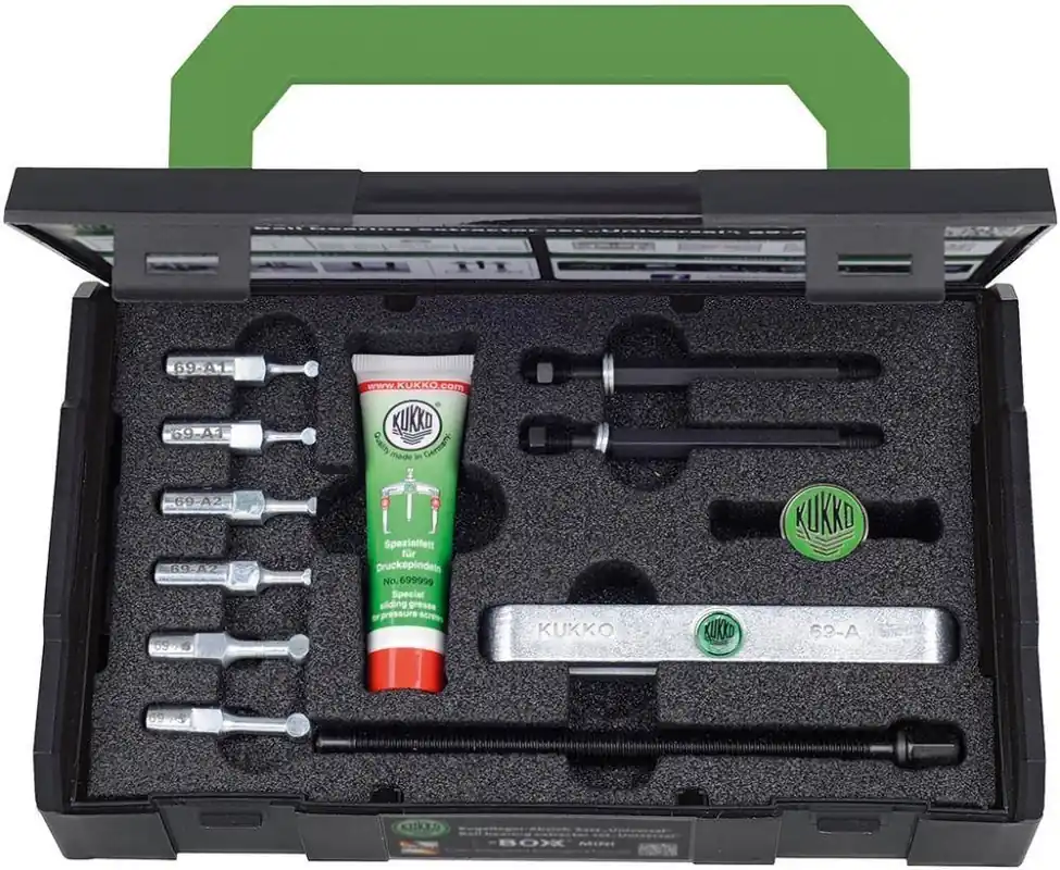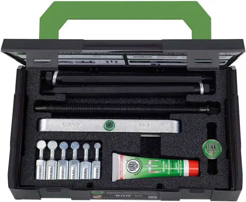 Zestaw do ściągania łożysk kulkowych, typ 69Wykonanie: specjalny kształt zapewnia precyzyjne osadzenie adapterów łożyskowych w łożysku kulkowymoraz równomierne ściąganie wewnętrznego i zewnętrznego pierścienia łożyska. Dostawa wpudełku L-Boxx MINI. Zastosowanie: do ściągania łożysk z nieprzelotowych otworów bez demontażu wału i innych prac. Znajdujeolbrzymie zastosowanie w dużej liczbie napraw i przy pracach serwisowych w wielu branżach.