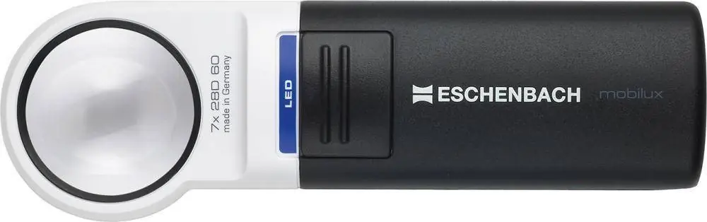 Oryginalna Ręczna Lupa Podświetlana Led Mobilux, Powiększenie 5 krotne D58mm Niemieckiej Firmy Eschenbach. Powiększenie: 5x Średnica soczewki: 58mmProfesjonalna, solidna lupa niemieckiej firmy Eschenbach.Lekka soczewka PXM z trwałą powłoką cera-tec zapewnia szerokie pole widzenia przy średnim zakresie powiększenia, w oprawie z tworzywa sztucznego wysokiej jakości.Soczewka odporna na złamanie oraz zarysowanie.SMD Led zapewnia żywotność do ok. 50.000 godzin.Produkt oferuje 3 temperatury barwowe które można zmieniać za pomocą filtrów.