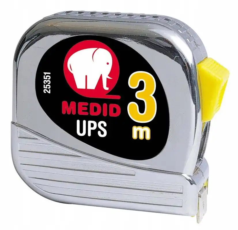 Metrówka Miara Taśma Miarka 3m 16mm Cromado UPS MedidSolidna Metrówka Miara 5m 19mm Cromado Medid.Odporna na uderzenia, solidna, miara 5m hiszpańskiej marki Medid.Dzięki chromowanej obudowie ABS świetnie zabezpieczona przed uszkodzeniami.Metrówka tradycyjnie posiada klips mocujący oraz samoczynnie się zwija.Dwustronny podział do łatwego odczytu pomiarów w poziomie oraz pionie.Podział naniesiony na taśmę odpowiada 2 klasie dokładności.Szczegóły oferowanego produktu:Materiał: Chromowane tworzywo ABS.Dwustronny podział.II klasa dokładności.Odporna na uderzenia.Wstęga odporna na zginanie.
