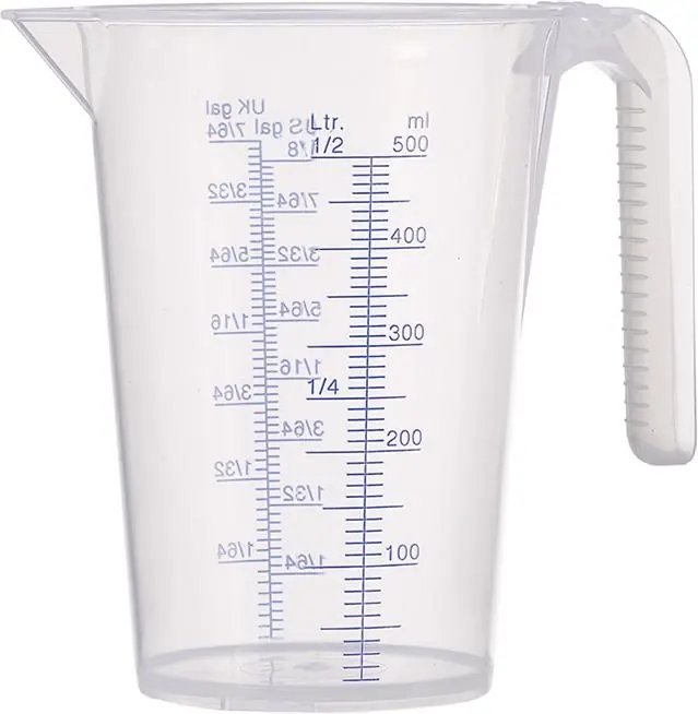 Miarka do oleju i chemii ze skalą 0,5 l – plastikowa Ilość: 1 sztuka Miarka, do oleju, do chemii, naczynie pomiarowe Miarka do oleju i chemii ze skalą 0,5 l Na każdej stronie naczynia pomiarowego wypukła, niebieska skala z nadrukiem Ergonomiczna rączka z rowkami dla lepszego chwytu Odporność na neutralne media, oleje, kwasy i alkohol Wolny od BPA Dostosowany do żywności według (EU) No. 10/2011 i FDA § 21 CFR 177.1520 Bardzo solidne i wysokiej jakości wykonanie Nadaje się do mycia w zmywarce, użytkowania w kuchence mikrofalowej i zamrażarce Wylewka umożliwia bezpieczne wylewanie Pierwsza skala w krokach co 10 ml i ze wskazaniem litrażu 1/4 i 1/2 l Druga skala do 1/8 gal USA i do 7/64 gal UK Odporny na złamanie i stabilny Możliwość sztaplowania Naczynie pomiarowe – PP – 0,5 l Przezroczyste – skala ml/l – US gal/UK gal Specyfikacja Pojemność (l): 0,5 Materiał: Polipropylen Kolor zbiornika: przezroczyste Zakres temperatury (°C): -20 / maks. +100 Podziałka skali 1: ml / l Podziałka skali 2: US gal / UK gal Wysokość (mm): 135 Powierzchnia podstawy dług. x szer. (mm): 145 x 100 Masa (kg): 0,0628