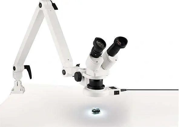 Mikroskop stereoskopowy Stereo z oświetleniem górnymWykonanie: widok nachylony, z możliwością obrotu o 360°, rozstaw oczu regulowany w zakresie 54 mm–74 mm. Okular o szerokim polu widzenia 10x, tubus okularu po lewej stronie z regulacją dioptrii w zakresie ±5 dpt. Rewolwer obrotowy o powiększeniu 1-krotnym i 2-krotnym, układ obiektywów w osi wzdłużnej, ustawianie ostrości za pomocą obustronnego dużego pokrętła. Z górnym oświetleniem pierścieniowym LED. Metalowe ramię przegubowe, 850 mm, z 3 śrubami ustalającymi w przegubach sprężynowych, z dowolną regulacją, z solidnym zaciskiem stołowym i podstawą mocowaną do stołu. Odpowiedni do stołów o grubości do 70 mm.