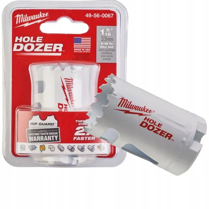 OTWORNICA WALCOWA MILWAUKEE HOLE DOZER 50mmNajnowsza technologia zapewniająca maksymalną wydajność.Projekt zęba – projekt ze zmienną ilością zębów 4-6 na cal z dodatnim kątem zęba 10° zapewnia następujące korzyści: – Szybsze i bardziej agresywne cięcie. – Wyższe rozpraszanie ciepła podczas cięcia – zęby dłużej pozostają ostre. – Głębsze, zakrzywione wręby między zębami zapewniają skuteczniejsze odprowadzanie wiórów, co zapobiega zapychaniu się i wzrostowi temperatury. – Specjalnie dobrany kąt zębów wykazuje mniejszą tendencję do zdzierania cieńszych materiałów. – Zęby są naprzemiennie rozwiedzione, co minimalizuje lepkość i tarcie. – Mały nacisk przy posuwie – uzyskany dzięki połączeniu agresywnej geometrii zębów i skutecznemu odprowadzaniu wiórów, w wyniku czego potrzebna jest mniejsza siła podczas wiercenia.Materiał zębów – najlepsza szybkotnąca stal typu Matrix II jest stosowana na uzębionym odcinku piły walcowej. Stal Matrix II zawiera 8% kobaltu, dzięki czemu zęby dłużej zachowują początkową twardość, nawet w wysokich temperaturach roboczych podczas cięcia metalu. – Konstrukcja bimetalowa – zęby ze stali szybkotnącej są przyspawane laserowo do korpusu ze stali wysokostopowej. Następnie zęby są utwardzane próżniowo do 65 HRC w temperaturze 600°C, w celu nadania maksymalnej trwałości i użyteczności. – Dzięki dużej odporności stali Matrix II na ścieranie, piły te idealnie nadają się do cięcia trudnych i twardych materiałów, takich jak stal nierdzewna i stal kwasoodporna, a także do cięcia miększych materiałów, np. drewna.Korpus piły walcowej – korpus piły walcowej ze stali o grubości 1,27 mm jest sztywny – zachowuje kształt, ale równocześnie wykazuje sprężystość. – Skuteczna głębokość cięcia wynosi 41 mm.Projekt płyty tylnej – płyty tylne są zbudowane z grubej stali, dzięki czemu otwory nie będą powiększać się z czasem. – Grube tyły podnoszą wytrzymałość i sztywność, minimalizując wibracje. – 4 otwory z kołkami prowadzącymi ułatwiają umiejscowienie trzpienia. – Doskonale wykonana okrągła płyta tylna, szczególnie ważna w piłach walcowych o większej średnicy.Ukośne rowki pomagają w usuwaniu i wypychaniu rdzenia.Zastosowanie – techniki produkcyjne wysokiej jakości zapewniają dużą precyzję obrotów, dzięki czemu te piły walcowe nadają się do użytku zarówno w wiertarkach ręcznych i stojakowych (wyłącznie ręczny posuw).Ta gama pił walcowych wysokiej jakości jest doskonałym rozwiązaniem do cięcia wszystkich rodzajów materiałów: – Stal do twardości 1000 N/mm² – stal nierdzewna i stal kwasoodporna – metale nieżelazne – żeliwo – aluminium – drewno – średniej gęstościDANE TECHNICZNEIlość w op.: 1Ø (mm): 50Maks. głębokość cięcia (mm): 41ZESTAW ZAWIERA:OTWORNICA WALCOWA MILWAUKEE HOLE DOZER 50mm