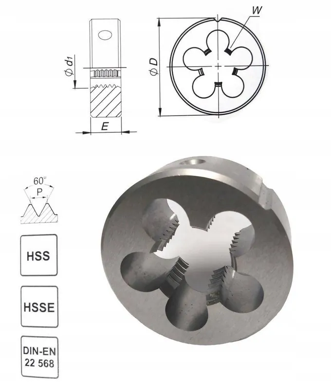 Narzynka M11 DIN-EN 22568 gwint metryczny zwykły HSS 800 FANAR (N1-121001-0110)Narzynka HSS 800 zgodna z DIN-EN 22 568 nacina gwint metryczny zwykły. Materiał, z jakiego została zrobiona narzynka – wysokowydajna stal szybkotnąca – charakteryzuje się wysoką odpornością na zużycie. Narzynka jest przeznaczona do stali konstrukcyjnych węglowych, automatowych i niskostopowych o wytrzymałości 600MPa<=Rm<=800MPa. Przed użyciem narzynki należy na elemencie obrabianym wykonać sfazowanie 45° w celu uniknięcia większych obciążeń krawędzi tnących. Narzynka powinna być ustawiona prostopadle względem śruby. Aby obciążenie zębów podczas obróbki było niższe, średnica pręta musi by zawsze mniejsza niż średnica zewnętrzna gwintu na narzynce.Dane techniczne:średnica nominalna gwintu: M11Skok gwintu: 1,5średnica zewnętrzna (d2) x grubość narzynki (h1): 30 x 11 mmOtwory wiórowe (W): 4Materiał: HSSNakrój: 1,75PTolerancja: 6gśrednica pręta do wykonania gwintu: 10,85 mm