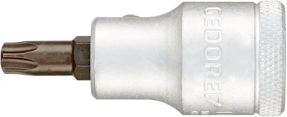 Nasadka wkrętakowa 1/2″ do śrub z łbem z gniazdem TORX®, długaWykonanie: Ze stali wanadowej 31CrV3 GEDORE, z rowkiem ustalacza kulkowego, szlifowana i chromowana,z poprawiającym chwyt radełkowaniem, wierzchołki ze specjalnej stali wanadowej GEDORE,oksydowana.