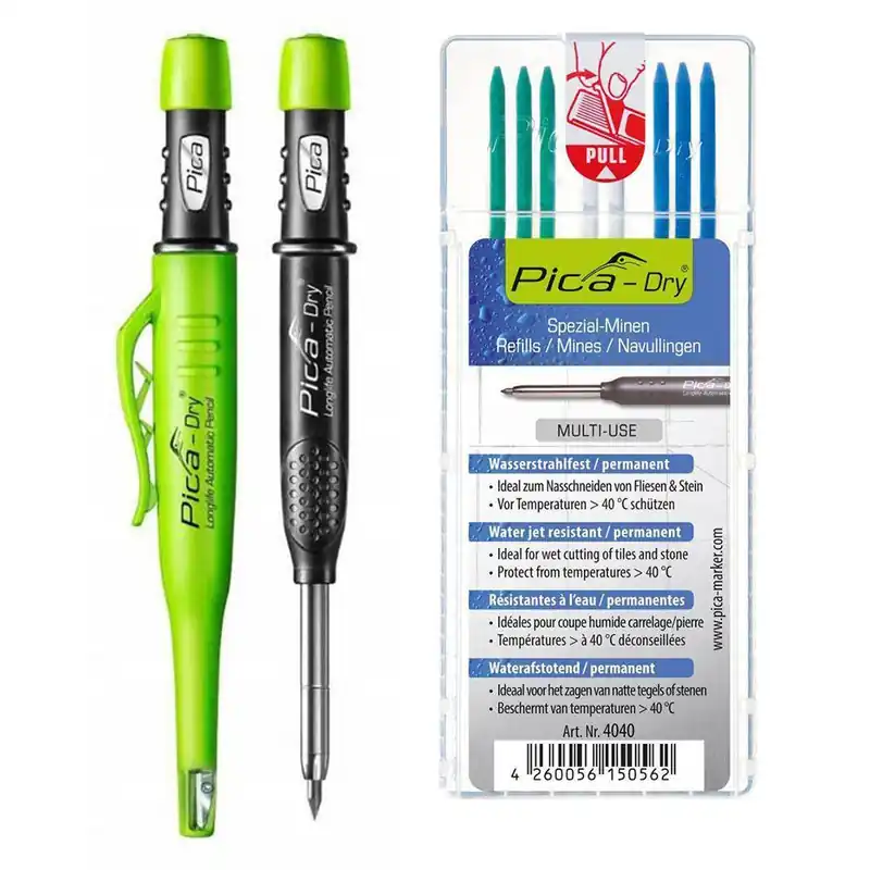 PROFESJONALNY SUCHY MARKER 3030 GRAFITOWY PICA W ZESTAWIE WKŁADY 4070Wykonanie: Wyposażony w uniwersalny wkład grafitowy, automatyczny mechanizm wysuwania wkładu umieszczonego w rurce ze stali szlachetnej, który zapobiega wypadaniu wkładu, z poręczną pochewką ochronną posiadającą praktyczny zaczep, umożliwiający łatwe wyciąganie jedną ręką i zintegrowaną z pochewką, temperówką do wkładu.Zastosowanie: Do pisania i znakowania na niemal wszystkich materiałach, nadaje się również do zakurzonych, szorstkich, tłustych i mokrych powierzchni. Zmywalny z powierzchni gładkich.Profesjonalne Wkłady do Ołówków, Znaczników Pica Big Dry 4070Specjalne wkłady Pica Big Dry Summer Heat 4070 letnie.Wysokiej jakości wkłady letnie do znaczników.Zakres pracy do 70°COferowany produkt doskonale nadaje się do większości powierzchni.Zestaw 12 letnich wkładów do znacznika zawiera:4 grafitowe uniwersalne.4 czerwone 2B4 zółte 2B
