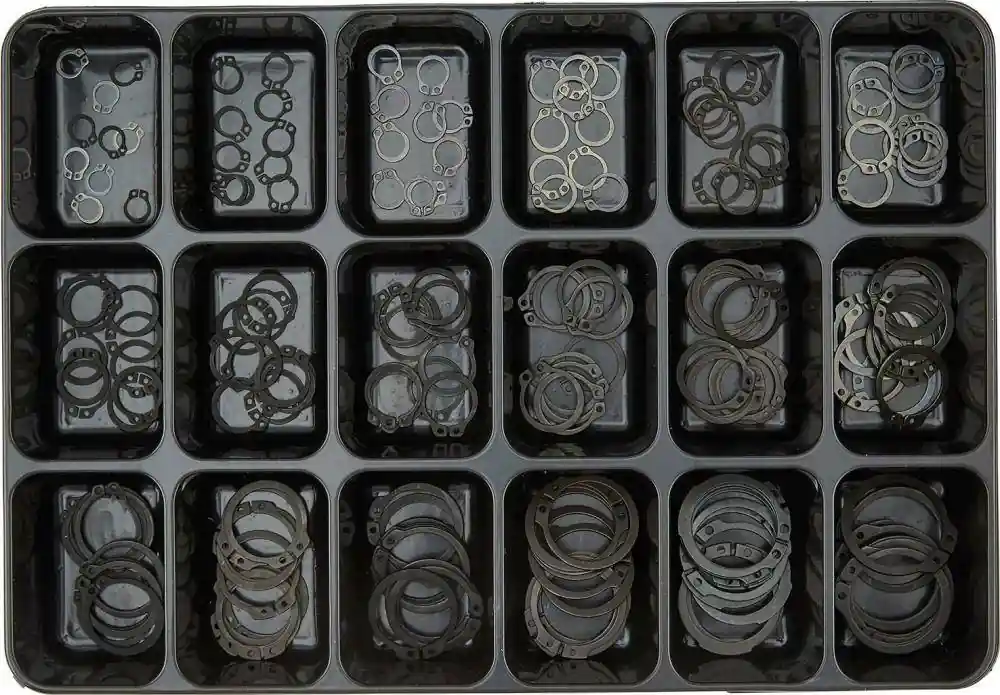 Pierścienie osadcze, DIN 472, czernioneZestaw nr 18 •180-częściowy zestaw pierścieni osadczych, DIN 472, w wytrzymałej kasecie stalowej Średnica wałka x grubość: 15 x 1,016 x 1,018 x 1,019 x 1,020 x 1,022 x 1,023 x 1,224 x 1,2 25 x 1,226 x 1,228 x 1,230 x 1,232 x 1,233 x 1,224 x 1,536 x 1,5 37 x 1,538 x 1,5