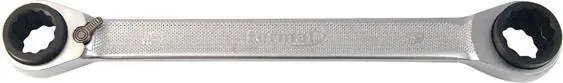 Klucz płaski z grzechotką pierścieniowąWykonanie: Ze stali chromowo-wanadowej. Chromowany, prosty kształt, z profilowaną rękojeścią zwytłoczeniem poprawiającym chwyt. Precyzyjnie uzębiony mechanizm grzechotki z 72 zębami ikątem roboczym 5°. odchylenie szczęk 15°. Momenty obrotowe są bardziej optymalnie niżwymagania DIN 3110, ISO 3318.