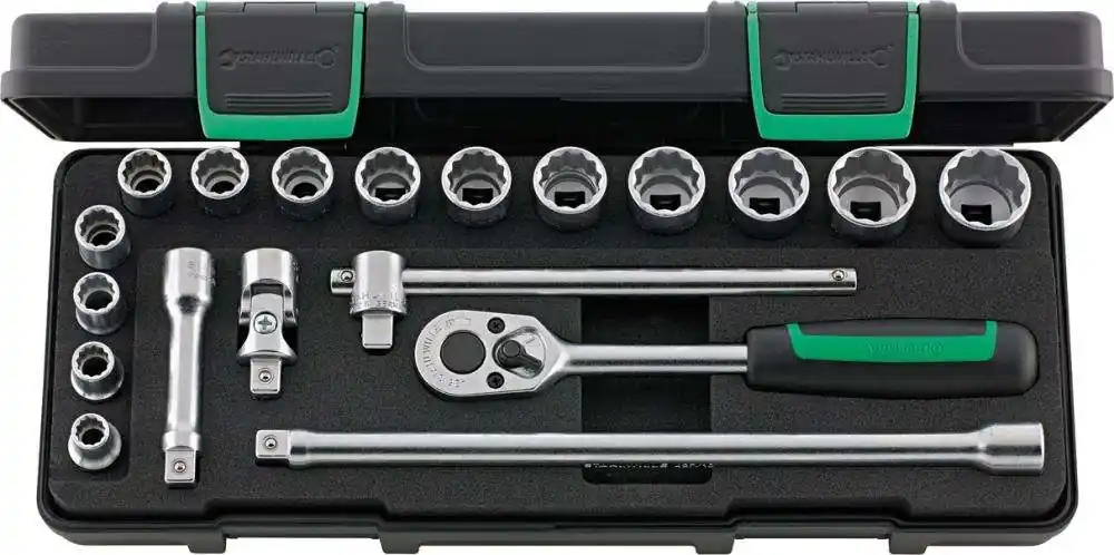 Zestaw końcówek wymiennych klucza nasadowego 3/8″•końcówki wymienne klucza nasadowego i akcesoria ze stali chromowo-wanadowej •kute i chromowane matowo •trzpienie wkrętakowych końcówek wymiennych klucza nasadowego wykonane ze stali S2 •kaseta z tworzywa sztucznego odporna na uderzenia, zamknięcia metalowe •narzędzia ułożone przejrzyście w dwukolorowej wkładce piankowej •schemat rozmieszczenia narzędzi w pokrywie Dostawa: w kasecie z tworzywa sztucznego. Zawartość: Grzechotka dwukierunkowa z przełącznikiem dźwigniowym 14 sześciokątnych końcówek wymiennych klucza nasadowego 8; 9; 10; 11; 12; 13; 14; 15; 16; 17; 18; 19; 21; 22 mm Uchwyt poprzeczny z elementem ślizgowym 3 przedłużki 75; 125; 250 mm Przegub Kardana