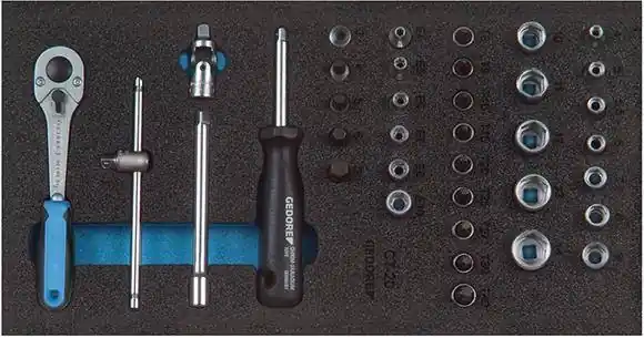 Moduł narzędziowy do kluczy płasko-oczkowych prostych, 25-cz., moduł 2/3Wykonanie: Wkład Check-Tool z 2-kolorowej pianki. Moduł 1/3 = 157,5 x 310 mm Moduł 2/3 = 315,0 x 310 mm Wskazówka: Pasuje do wózków warsztatowych GEDORE (kod art. 6170 0040, 6170 0150 i 6170 0140). Pasuje do stołów warsztatowych na kółkach Gedore (kod art. 6170 0011, 6170 0015 i 61700020).Zawartość zestawu: 17 kluczy płasko-oczkowych 6; 7; 8; 9; 10; 11; 12; 13; 14; 15; 16; 17; 18; 19; 20; 21; 22 mm 8 kluczy trzpieniowych, kątowych 2; 2,5; 3; 4; 5; 6; 8; 10 mm