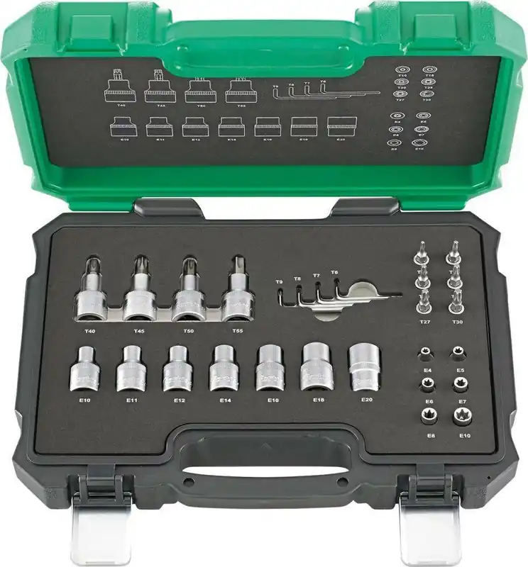 Zestaw wkrętakowych końcówek wymiennych klucza nasadowego 1/4″ i 1/2″ , do śrub z gniazdem sześciokątnym•trzpień ze stali S2 Dostawa: w kasecie z tworzywa sztucznego z 2-kolorową wkładką piankową i schematem rozmieszczenia narzędzi w pokrywie. Zawartość: 4 wkrętakowe końcówki wymienne klucza nasadowego 1/4″ do śrub z gniazdem sześciokątnym 3; 4; 5; 6 mm 8 wkrętakowych końcówek wymiennych klucza nasadowego 1/2″ do śrub z gniazdem sześciokątnym 5; 6; 7; 8; 10; 12; 14; 17 mm 2 wkrętakowe końcówki wymienne klucza nasadowego 1/2″ do śrub z gniazdem sześciokątnym, długość 100 mm; 8; 10 mm 5 kluczy trzpieniowych 1,25; 1,5; 2; 2,5; 3 mm