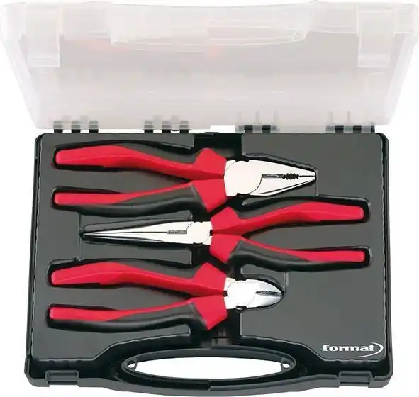 solidny Zestaw szczypiec format – uniwersalne, bocze, półokrągłeZestaw szczypiec, 3 części Wykonanie: Dostarczane w walizce z tworzywa sztucznego. Główki polerowane, rękojeści pokryte tworzywem. Zawartość zestawu: 1 szczęki tnące boczne, 160 mm (nr zam. 5290) kombinerki, 180 mm (nr zam. 5145) 1 szczypce tnące wydłużone „bociani dziób” 200 mm, szczęki proste (nr zam. 5226)Rękojeści z nasadkami z tworzywa sztucznegoW zestawie :Szczypce tnące boczne 160mmSzczypce uniwersalne kombinerki 180mmSzczypce półokrągłe wydłużone bociani dziób 200mm