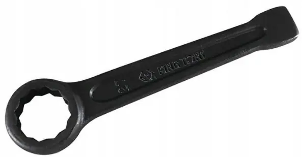 Firma KING TONY dzięki zastosowaniu najnowszych technologii, japońskich patentów, najwyższej jakości materiałów oraz szczegółowej kontroli procesu produkcji uzyskuje profesjonalne wyroby o wytrzymałości zdecydowanie przekraczającej wymagania międzynarodowych norm DIN (Niemcy) i ANSI (U.S.A.). Korporacja rozwija się bardzo dynamicznie, stale powiększając gamę oferowanych produktów, poszukując nowych i lepszych rozwiązań oraz pilnie śledząc potrzeby ciągle rosnącej rzeszy klientów.Klucz oczkowy do pobijania Nr katalogowy – 10B0-27UWAGA!!! Rzeczywisty rozmiar i długość klucza mogą różnić się od tego na zdjęciu.Specjalistyczny klucz oczkowy przeznaczony do pracy w ciężkich warunkach serwisowych pod zmiennymi obciążeniami. Klucz wykonany został ze stali chromowo-wanadowej Cr-V, powierzchnia fosforanowana. Klucz jednostronnie oczkowy o profilu 12-kątnym ze wzmocnioną końcówką służącą do pobijania. Idealnie nadaje się do odkręcania zapieczonych śrub i nakrętek. Klucz spełnia normy DIN 7444.DANE TECHNICZNE: rozmiar – 27mm L – 180mm D – 46mm H – 17mm waga – 0,330kg