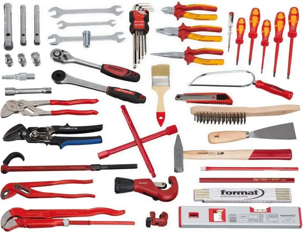 Zestaw narzędzi do instalacji sanitarnych, 50-cz.Zawartość zestawu: 1 cęgi do rur, 250 mm 2 dwustronne klucze płaskie 10 x 13; 17 x 19 mm 3 klucze nasadowe rurkowe 10 x 11; 12 x 13; 17 x 19 mm 1 klucz stopniowy do zaworów UNI, z grzechotką, 3/8″ –1″ 1 klucz montażowy 17 x 19 mm; M10 1 klucz krzyżakowy do sanitariatów 3/8″ ; 1/2″ ; 3/4″ ; 1″ 9 kluczy trzpieniowych, kątowych z główką kulistą 1,5; 2; 2,5; 3; 4; 5; 6; 8; 10 mm 1 grzechotka dwukierunkowa z przełącznikiem dźwigniowym 1/2″ , 60 zębów, z rękojeściąKraftkant® 1 przedłużka 1/2″ , 125 mm 3 końcówki wymienne klucza nasadowego, sześciokątne 1/2″ , 10 ; 13; 17 mm 1 szczypce do rur kątowe 1″ , 320 mm 1 mały obcinak do rur 1/8–5/8″ 1 kompaktowy obcinak do rur 1/8–1.3/8″ 1 klucz do baterii stojących 1 szczypce nastawne do rur 240 mm 1 przecinak dla elektryków, 250 x 10 mm 1 młotek ślusarski z tulejką ochronną, 300 g 1 pilnik warsztatowy, półokrągły, spiczasty, H1, 250 mm 1 2-komponentowy uchwyt do pilnika do 300–350mm 1 szczotka druciana, nierdzewna, gładka, 4-rzędowa 1 piła do metalu PUK®, 150 mm 1 próbnik napięcia, 1-biegunowy, 140 mm 3 wkrętaki VDE, z rękojeścią Kraftkant®, płaskie 3,5; 5,5; 6,5 mm 2 wkrętaki VDE, z rękojeścią Kraftkant®, krzyżowe, płaskie PH 1; 2 1 ołówek stolarski 1 metrówka składana drewniana 2 m 1 poziomnica z metalu lekkiego, 30 cm 1 nóż uniwersalny, 18 mm 1 pędzel do lakieru, włosie mieszane, 2″ 1 szczypce tnące boczne VDE, 160 mm 1 szczypce uniwersalne VDE, 180 mm 1 szczypce tnące wydłużone (typu „bociani dziób”) VDE, 200 mm 1 szpachla malarska, 50 mm 1 nożyce do blachy Ideal z przełożeniem dźwigni, prawotnące, 260 mm Wskazówka: Wszystkie narzędzia w podanym zestawie odpowiadają opisowi katalogowemu. Zastrzegamysobie prawo do zmian w zestawieniu elementów kompletu.