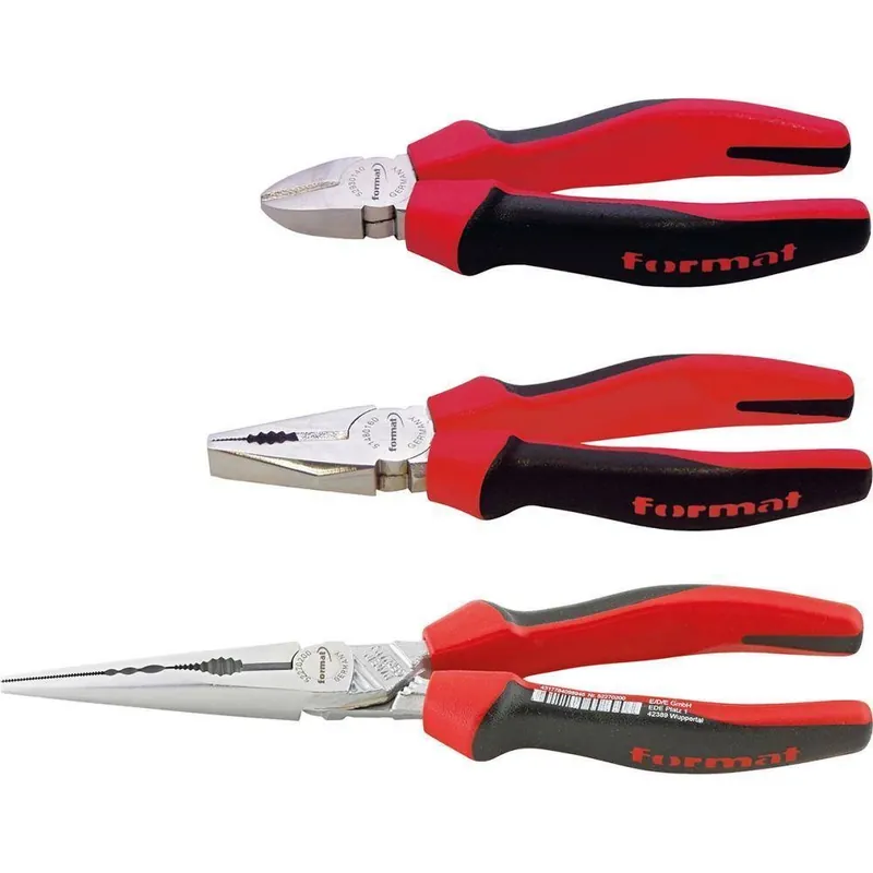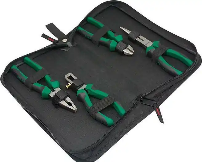 Zestaw szczypiec, główki chromowaneGłówki chromowane . Dostawa w skrzynce z wkładem piankowym, wymiarydł. x szer. x wys. 335 x 165 x 33 mm.Zawartość zestawu: 1 szczypce uniwersalne 180 mm 1 szczypce tnące wydłużone (typu „bociani dziób”), 200 mm 1 szczypce tnące boczne o zwiększonym przełożeniu, 180 mm 1 szczypce nastawne do rur Cobra®, 250 mm