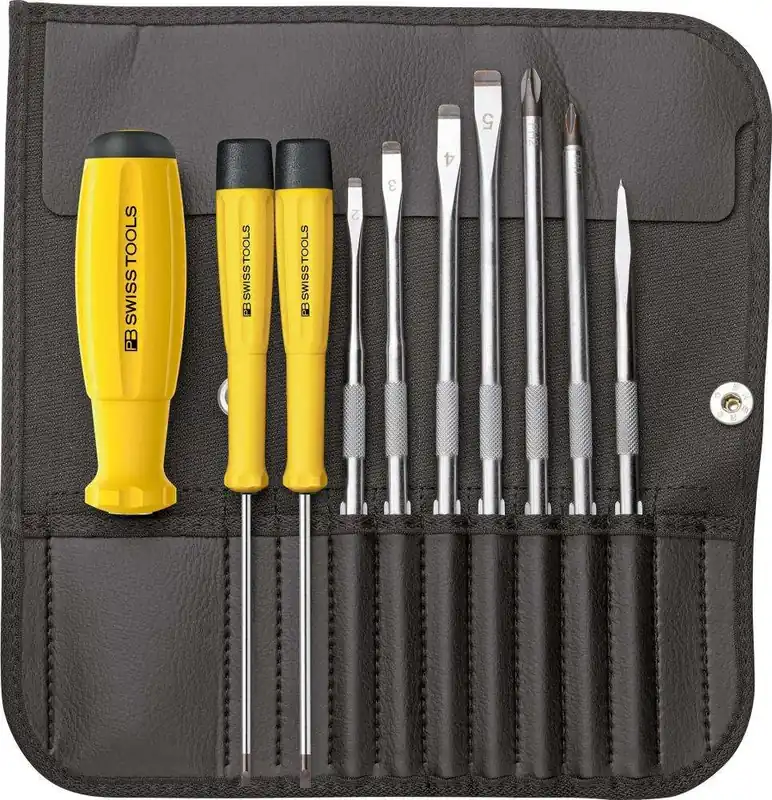 Zestaw wkrętaków ESD dla elektronikówWykonanie: z zaokrągloną, gumowaną, 2 rękojeścią SwissGrip, antypoślizgową nawet w przypadku mokrych i zanieczyszczonych smarem rąk, dobre przenoszenie momentu obrotowego. Dodatkowo wkrętaki posiadają wytłoczenie z symbolem profilu i wielkości. Dostawa w zwijanym etui. Wykonanie:rozpraszająca ładunki elektrostatyczne, zabezpieczająca wrażliwe na wyładowania elementy elektroniczne, do miejsc pracy zabezpieczonych przed ESD.1 rękojeść ESD 2 wkrętaki ESD do śrub z rowkiem prostym 2,5 x 0,4; 3,5 x 0,5 mm 4 trzpienie do śrub z rowkiem prostym 4 x 0,6; 5,5 x 0,8; 6,5 x 1; 8 x 1,2 mm 2 trzpienie do śrub z gniazdem krzyżowym PH 1; 2 1 szydło z trzpieniem 4-kątnym