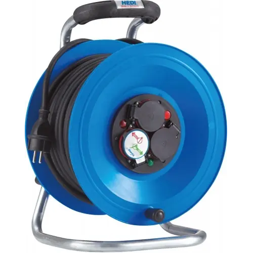 Bęben kablowy o solidnej konstrukcji w obudowie z trwałego tworzywa sztucznego. Charakterystyczne dla niego jest posiadanie wtyczki typu E, co czyni go idealnym do zastosowań na placach budowy. Model ten został osadzony na ocynkowanym stelażu, który posiada trzy gniazda wtykowe francusko-belgijskie typu E ze stykiem ochronnym. W celu zapewnienia bezpieczeństwa, bęben kablowy został wyposażony w zabezpieczenie przed wodą rozpryskową, a także posiada samozamykające się pokrywy. Dodatkowo wyposażono go w mechanizm zabezpieczający przed przeciążeniem, który chroni podłączone do przedłużacza urządzenia. Lampka kontrolna sygnalizuje przegrzanie, co stanowi dla nas wizualne ostrzeżenie.Kabel zgodny z normą VDE 0100 art. 704 jest przystosowany do pracy w trudnych warunkach zarówno wewnątrz pomieszczeń, jak i na otwartych placach budowy, co czyni go niezastąpionym i gwarantuje zarówno niezawodność, jak i trwałość podczas stałego użytkowania na zewnątrz.