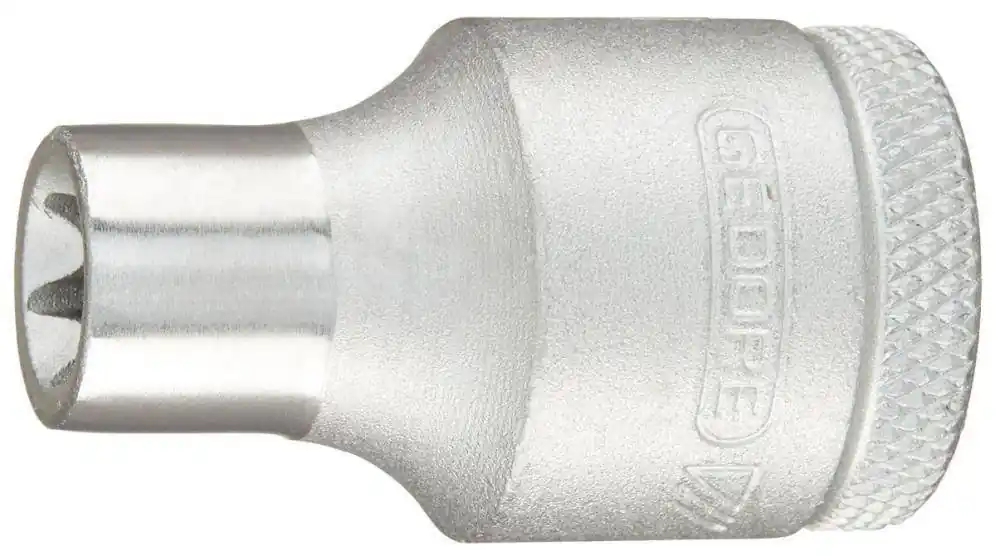 Końcówka wymienna klucza nasadowego 1/2″ do śrub z łbem TORXWykonanie: Szlifowana i matowo chromowana. Z rowkiem ustalacza kulkowego i radełkowaniem.Ze stali wanadowej 31CrV3 GEDORE.