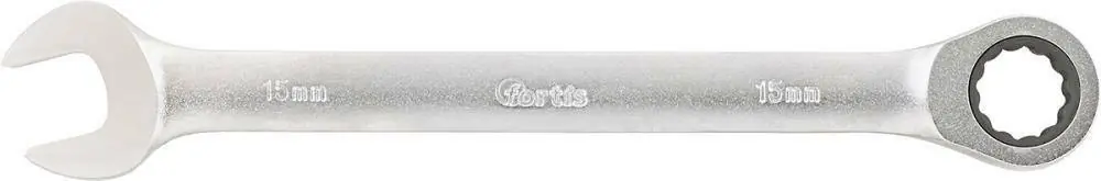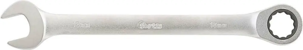 Klucz płasko-oczkowy, z grzechotką•chromowany matowo •ze stali chromowo-wanadowej •końcówka otwarta odchylona od osi o 15° •końcówka oczkowa z grzechotką, prosta •kąt powrotu zapadki 6°
