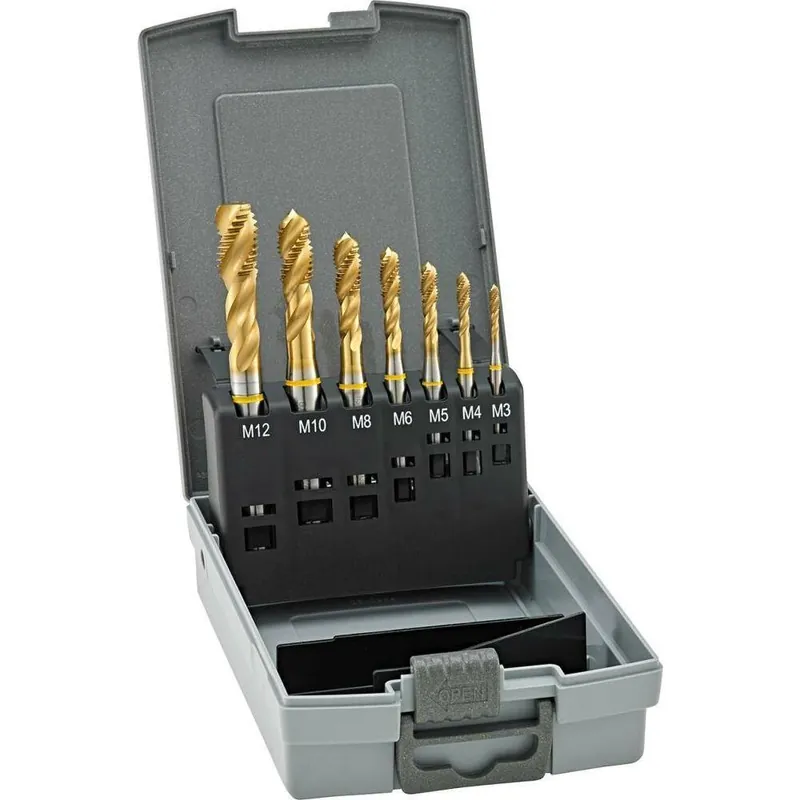 Zestaw gwintowników maszynowych do otworów przelotowychWykonanie: Dostarczane w wysokiej jakości wytrzymałej kasecie z tworzywa sztucznego. M3–M10DIN 371 ze wzmocnionym chwytem. M12DIN 376 z chwytem przelotowym.Zawartość zestawu: 7 gwintowników M3; 4; 5; 6; 8; 10; 12