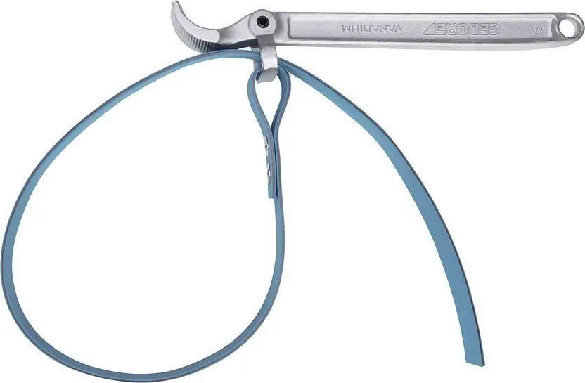 Klucz taśmowy•kuty, chromowany •antypoślizgowa taśma tkaninowa •do mocowania okrągłych części o większych średnicach