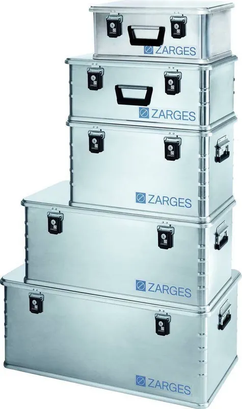 Stabilna skrzynka z metalu lekkiego ZARGES• bezpieczne, czyste i zabezpieczone przechowywanie • niezwykle wytrzymały, odporny na korozję stop aluminium • ochrona przed kurzem i wodą • zawiasy ze stali nierdzewnej • obwodowa uszczelka w pokrywie • zamknięcia klapowe z zatrzaskami • sprężynowy uchwyt zapadkowy z powłoką z tworzywa sztucznego (wyjątek: model Mini-Box XS i Mini-Box z jednym uchwytem z przodu) • pokrywa samotrzymająca* Uchwyt skrzyni z przodu.