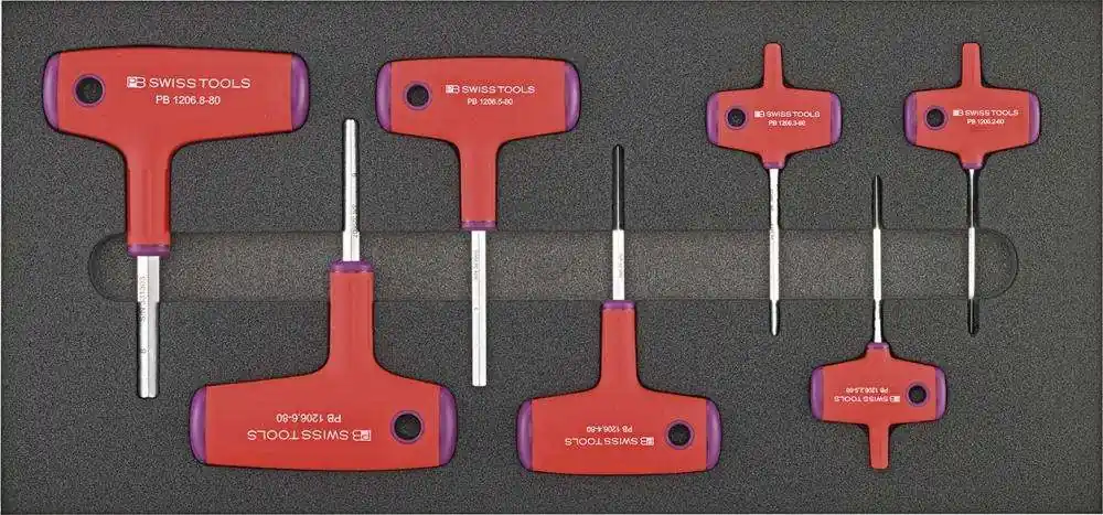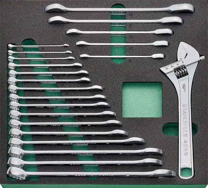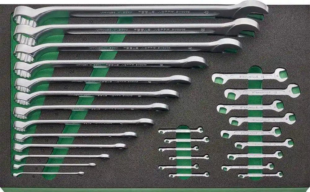 Moduł narzędziowy z kluczami, 28-częściowy, moduł 2/3Wykonanie: narzędzia bezpiecznie przechowywane w dwukolorowej wkładce piankowej odpornej na działanie chemikaliów i pozwalającej na szybką identyfikację brakujących narzędzi. Moduł 1/3 = 175 x 350 mm Moduł 2/3 = 350 x 350 mm 3/3+ moduł = 530 x 350 mm Zestaw narzędzi w modułowym systemie wkładek narzędziowych Tool Control System (TCS).Zestaw kluczy, 28-częściowy 13 kluczy płasko-oczkowych 6; 8; 10; 13; 14; 17; 19; 21; 22; 24; 27; 30; 32 mm 15 kluczy płaskich, dwustronnych 3,2; 3,5; 4; 4,5; 5; 5,5; 6; 7; 8; 9; 10; 11; 12; 13; 14 mm