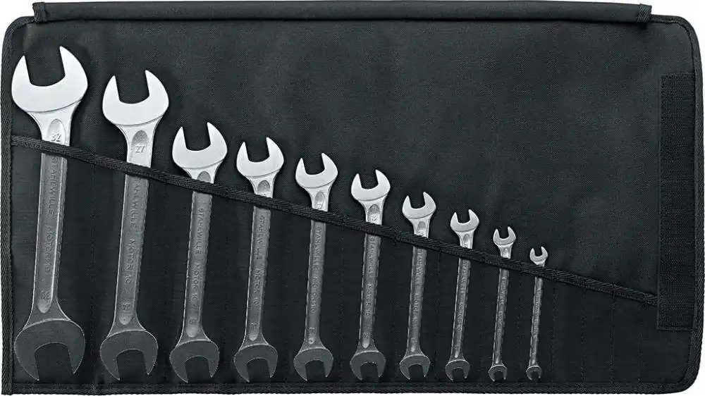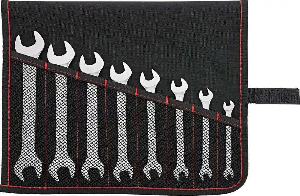 Zestaw kluczy płaskich dwustronnych, w składanym etuiWykonanie: DIN 3110, ISO 3318. Chromowane matowo, końcówki otwarte odchylone pod kątem 15°, z płaskimi główkami. Dostawa w zwijanym etui.Stal chromowa, chromowana. Stabilna część chwytowa z profilem dwuteowym.